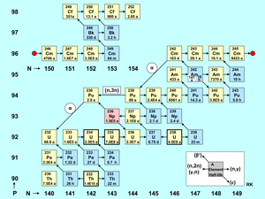 Jedes Quadrat der Abbildung stellt ein Actinoid-Nuklid dar, das in einem Kernreaktor auftreten kann. Die Abbildung zeigt auch das Netzwerk von Bildung und Zerfall von Actinoid-Nukliden, ausgelöst durch den Neutroneneinfang freier Neutronen und durch andere Kernreaktionen. Ein ähnliches Schema findet man in einer Arbeit[8] aus dem Jahr 2014. Dort sind die Isotope von Thorium und Protactinium, die zum Beispiel in Salzschmelzenreaktoren eine große Rolle spielen, und die Isotope der Elemente Berkelium und Californium nicht enthalten.